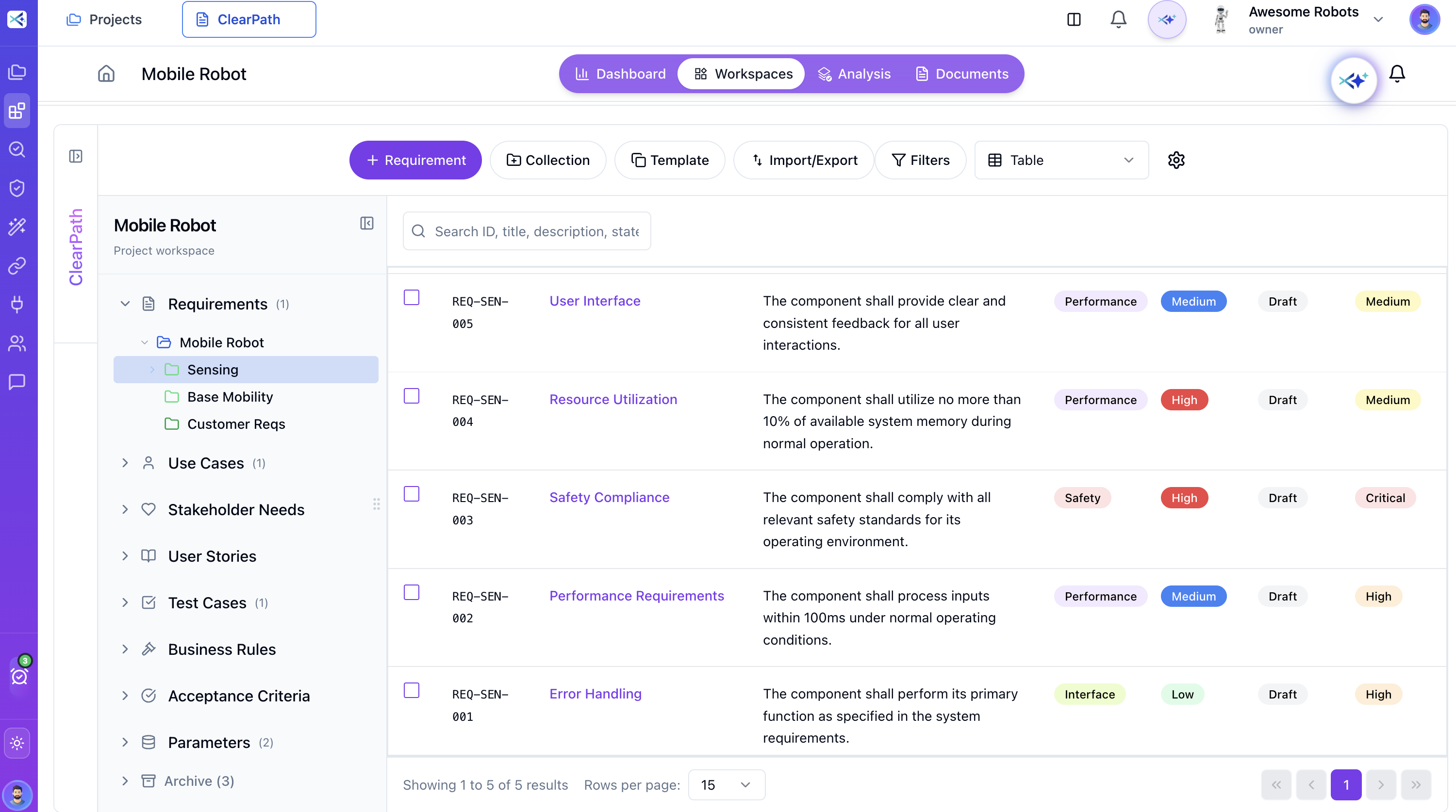Visualize requirement distribution by tag, type, status, and verification state with instant identification of isolated and orphaned requirements. Transform complex project data into actionable compliance insights that keep stakeholders aligned.